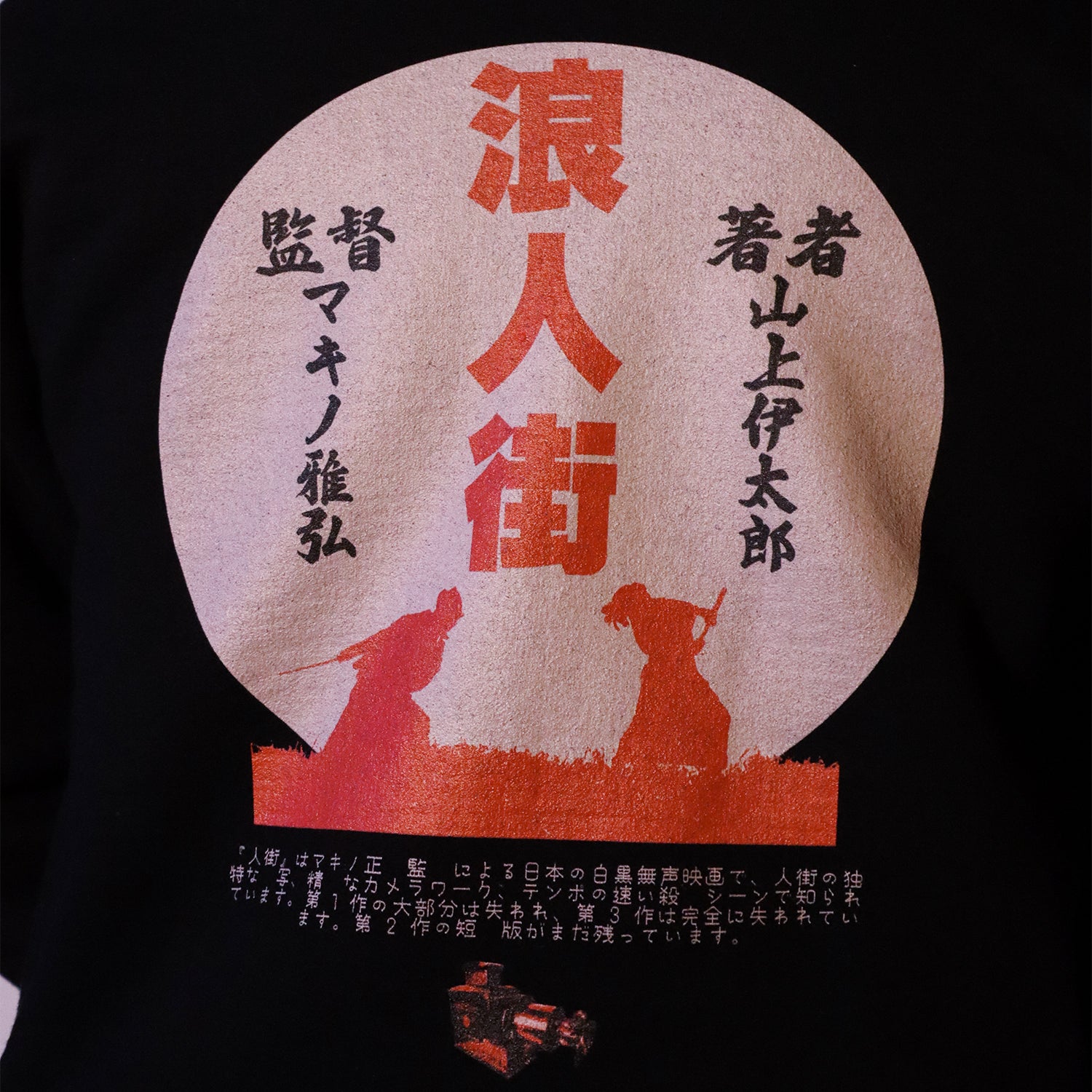 This design is inspired by the 1928 Japanese film, Roningai, which is written in Japanese down the center of the back of the shirt. It was directed by Masahiro Makino, as written on the left, and written by Itaro Yamagami, as written on the right.